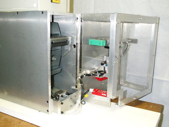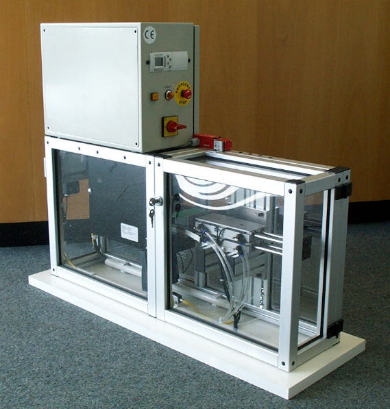 Robotix designed and built two fully automatic test stations. Each test station used pneumatic actuators to mimic the operators actions ( including their heavy handedness ). Optical and inductive sensors monitor the functionality of each feature of the cash drawer, continuously checking the operation of the drawer and the test station - sometimes up to one hundred thousand cycles before stopping. Each actuator on the test station is fully adjustable for stroke, position, speed, power and heavy handedness. |